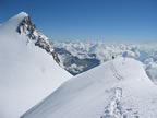 Gnifetti ( 3611 m) Probablement la journée la plus spectaculaire, avec un enchaînement de 5 sommets de plus de 4000 m dans un décor de rêve ! Nous partons avant le lever du soleil car nous ne connaissons pas réellement l'ampleur de cette journée. Les distances paraissent importantes et les sommets pas si petits que ça. Mais finalement, tout cela va assez vite et nous avons même eu le temps de prendre une longue pose au pied de la Parrot avec nos amis belges ! Nous remontons en direction du Col Vincent (4087 m), entre la Pyramide et le Corno Nero et grimpons juste au-dessus le Balmenhorn, îlot rocheux perdu au milieu de glacier. Dix pas d'escalade et une corde fixe nous mènent vers le bivouac Felice Giordani et la statue du Christ que le surplombe. Un petit vent frais nous pousse vers le bas et nous remontons vers le Corno Nero. Nous découvrons alors que la pente qui monte aux rochers sommitaux fait bien dans les 50°... Mais la rimaye passe facilement et les pointes avant de nos crampons mordent facilement dans la neige durcie puis la petite zone en glace. Nous nous demandons comment redescendre. En "marche arrière" en posant une broche ? Ou en rappelle comme certains ? Mais la pente fait 50 m et notre corde ne nous permet qu'un rappel de 25 m ! Nous demandons prudemment à la cordée française d'à côté (il sont 4 ou 5) si nous pouvons profiter de leur rappel... La promesse d'une tournée de bière au refuge fait pencher la balance et nous dévalons rapidement la pente. Nous discutons avec ces alpinistes sympathiques puis nous partons vers la Ludwigshöhe et sa belle arête. De là nous traversons en direction de la Parrotspitze, longue bosse avec une magnifique arête qui mène à son sommet. Au pied nous croisons nos Belges et leur guide Christophe. Il descendent de Margherita (leur programme a été chamboulé par les mauvaises conditions sur Castor quelques jours plus tôt) en cueillant au passage quelques 4000. Nous montons des rochers pour atteindre l'arête neigeuse puis jouons les équilibristes jusqu'au sommet. Nous en redescendons sur le versant nord et pique-niquons au Seserjoch (4296 m). Il ne nous reste plus qu'à contourner la Signalkuppe et ses séracs et à atteindre son sommet, où trône le refuge le plus haut des Alpes, la Capanna Regina Margherita. Nous en sommes à notre 9e 4000, sommets principaux et secondaires confondus ! La vue splendide fait penser à celle que nous pourrions avoir depuis un avion, avec des nuages en-dessous à perte de vue sur l'Italie. Nous retrouvons les Français du Corno Nero et payons la tournée (non-alcoolisée...) promise. Ils repartent immédiatement vers la Monta Rosa Hütte, 1600 m plus bas, car ils n'ont pas de place pour dormir. Nous prenons nos quartiers (chambre avec vue... et balcon !!) et nous couchons pour une petite sieste. Nous sombrons rapidement malgré l'altitude. Depuis cinq jours que nous sommes en haute altitude, nous sommes maintenant acclimatés. L'accueil est chaleureux est la nourriture bien meilleure qu'à Gnifetti, alors que nous sommes à 4500 m ! Comme quoi... Nous discutons avec le gardien des conditions sur la Pointe Dufour (4634 m), point culminant de notre périple. L'arête SE, la voie au départ de Margherita n'a pas encore été parcourue depuis la période mauvais temps et la nuit précédente fut la première pendant laquelle il n'a pas neigé ! Donc aucune trace et probablement trop de neige et des problème pour franchir la Grenzsattel, collu entre la Zumsteinspitze et l'arête SE. A regret, nous renonçons au plus haut sommet suisse, mais c'est plus raisonnable. Nous mettrions beaucoup trop de temps ! Dommage, car la voie normale de la Dufour depuis la Monte Rosa Hütte est nettement plus longue...
