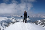 Nous faisons une petite pose sur un replat puis repartons. Il commence à faire chaud, le temps est magnifique ! Au bout d' 1h30 le petit sommet triangulaire, qui n'est qu'une antécime, est visible. Impossible de se perdre. Nous posons les skis 100m sous le sommet, Maud met ses crampons et nous remontons cette dernière pente. Depuis les rochers nous avons tout loisir d'observer le coeur des Alpes Valaisannes, du Mont Fort - impressionant sous cet angle - à la Dent Blanche en passant par le Mont Blanc de Cheillon, mais des bancs de cumulus nous cachent quelques sommets, comme le Weisshorn.
