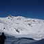 Descente au radar dans une neige merveilleuse poudreuse et légère: +1 point pour le guide. Nous passons bientôt sous le brouillard pour constater que le temps se couvre un peu partout. Nous ne traînons pas et continuons notre descente dans une neige de très bonne qualité. Arrivé sur la plateau vers 2600 mètres la rigolade commence. Les montées-descentes-montées de l'aller se transforment en descentes-montées-descentes. Autant dire qu'en snow j'en bave ... je teste la marche, le quatre pattes et le pousser de bâtons. Je mentionne au guide qu'une descente se descend et ne se monte pas! Il se marre ... du coup -2 points pour lui! Nous nous retournons et ... voyons le sommet au soleil !